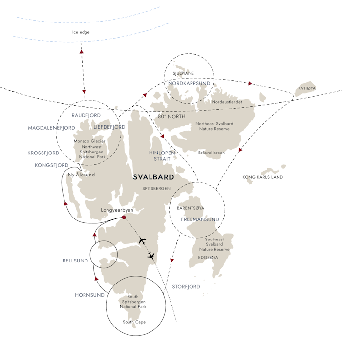If you'd like to spend two extra days exploring Longyearbyen and its surroundings before your voyage, see this voyage option. It includes the same sailing itinerary but with additional Arctic land adventures.