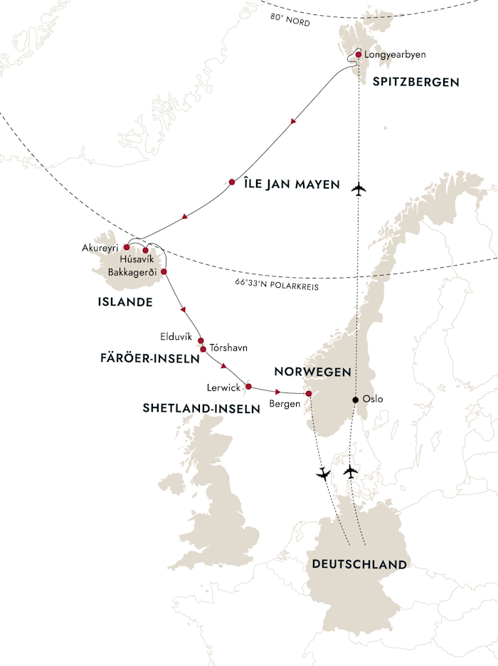 - Flight in economy class from Oslo to Longyearbyen before the expedition cruise