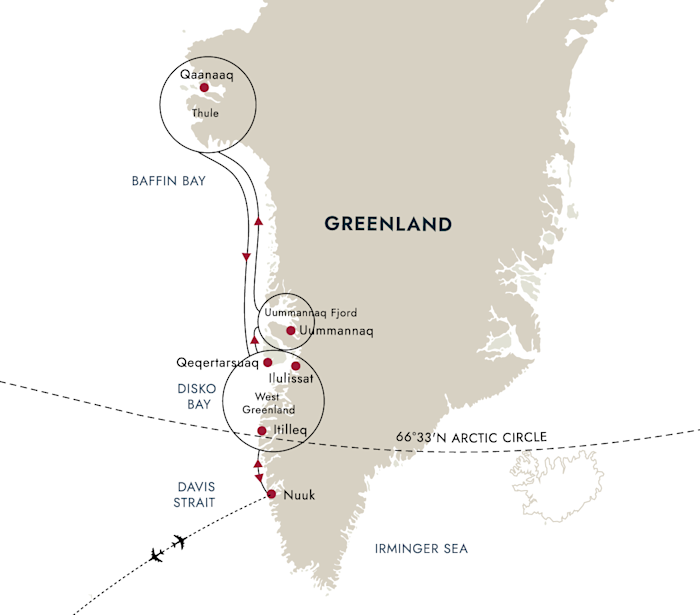 This voyage begins and ends in Nuuk with flights from/to New York. An option to fly from/to Copenhagen or Reykjavik instead is also available.