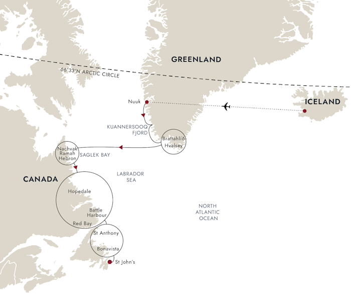 Setting out from Nuuk, join us as we sail down the west coast of Greenland and traverse the Labrador Sea, exploring Newfoundland and sub-Arctic Canada.