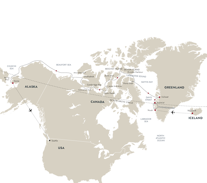 Our 26-day voyage takes us ‘above’ the North American continent to the frozen Far North. In Eastern Arctic Canada, specifically the waterways around Lancaster Sound, you’ll experience a pristine and remote wilderness that shows off nature’s raw beauty. As we pass into the Western Arctic, the region is marked by its proximity to Alaska. Look out for wildlife as we sail through the famed Beaufort Sea and Bering Strait, before ending our cruise in Alaska and flying to Seattle in the US Pacific Northwest.