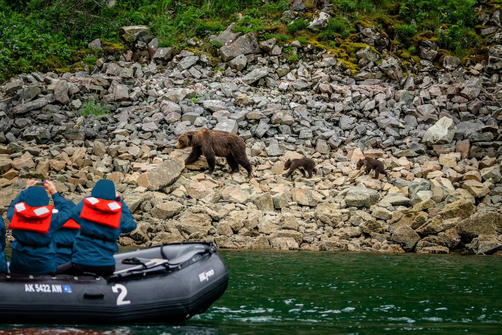 Accompanied by an experienced bear guard, we'll safely scout for them from the deck or in our small expedition boats. They might be foraging for berries, digging for clams or catching fish in the stream.