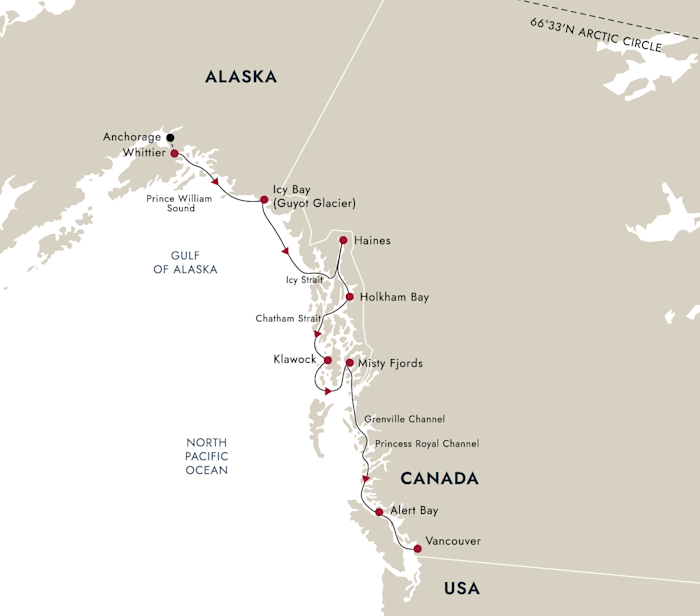 Seeking out culture, just as much as nature, will be our aim as we experience a warm welcome from the local native peoples of Klawock and Alert Bay. Here, we’ll see an impressive collection of totem poles and watch a Kwakwaka’wakw dance performance by the T’sasala Cultural Group. We’ll also explore historic Haines, framed by the mighty Chilkat and Takshanuk Mountains, as well as the immense Tongass National Forest before ending our journey in British Columbia’s Vancouver.