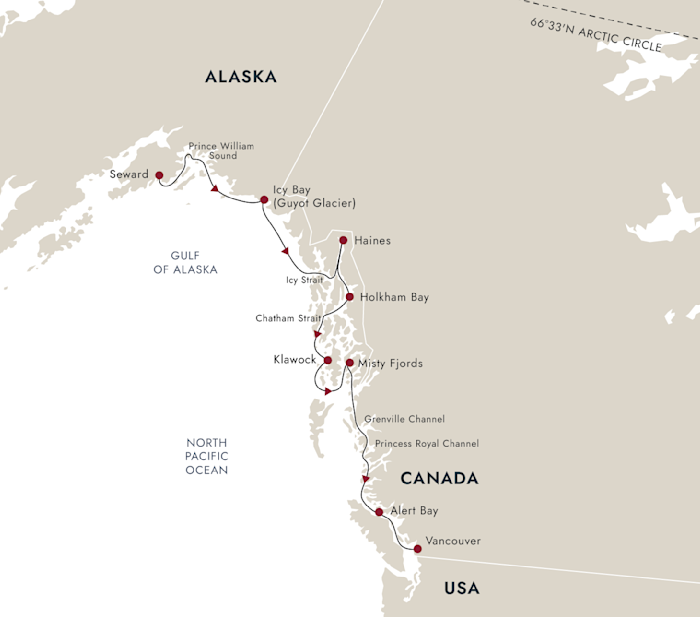 Seeking out culture, just as much as nature, will be our aim as we experience a warm welcome from the local native peoples of Klawock and Alert Bay. Here, we’ll see an impressive collection of totem poles and watch a Kwakwaka’wakw dance performance by the T’sasala Cultural Group. We’ll also explore historic Haines, framed by the mighty Chilkat and Takshanuk Mountains, as well as the immense Tongass National Forest before ending our journey in British Columbia’s Vancouver.
