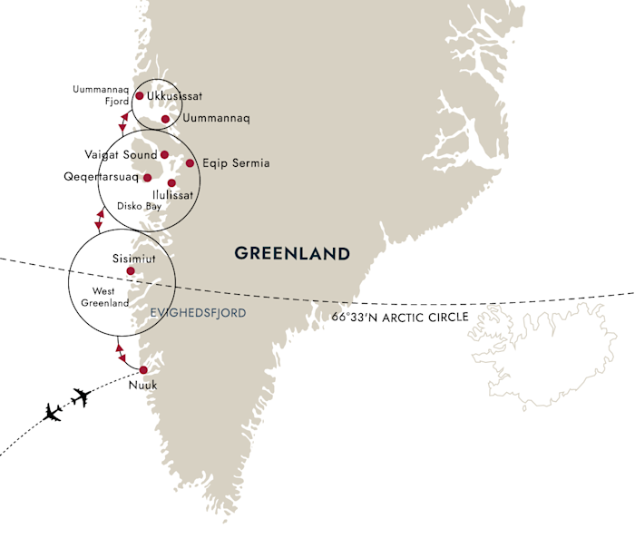 This voyage begins and ends in Nuuk with flights from/to New York. An option to fly from/to Reykjavik instead is also available.