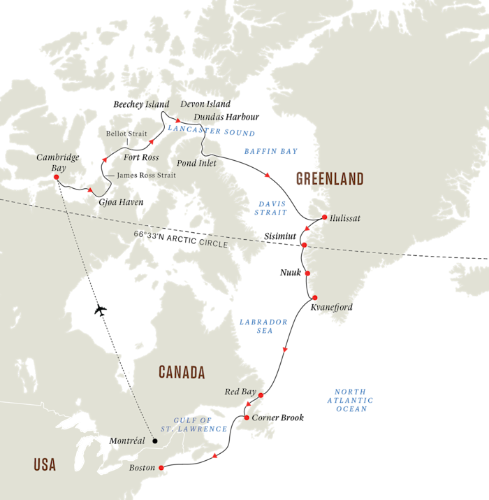 We start off by exploring lively Montréal before flying to Cambridge Bay, where our sea expedition begins into the Northwest Passage. Over the next seven days, we’ll explore the islands that dot this notoriously challenging territory, navigable for only a few weeks of the year. Exactly what we’ll see and do depends on the sea ice and weather conditions.